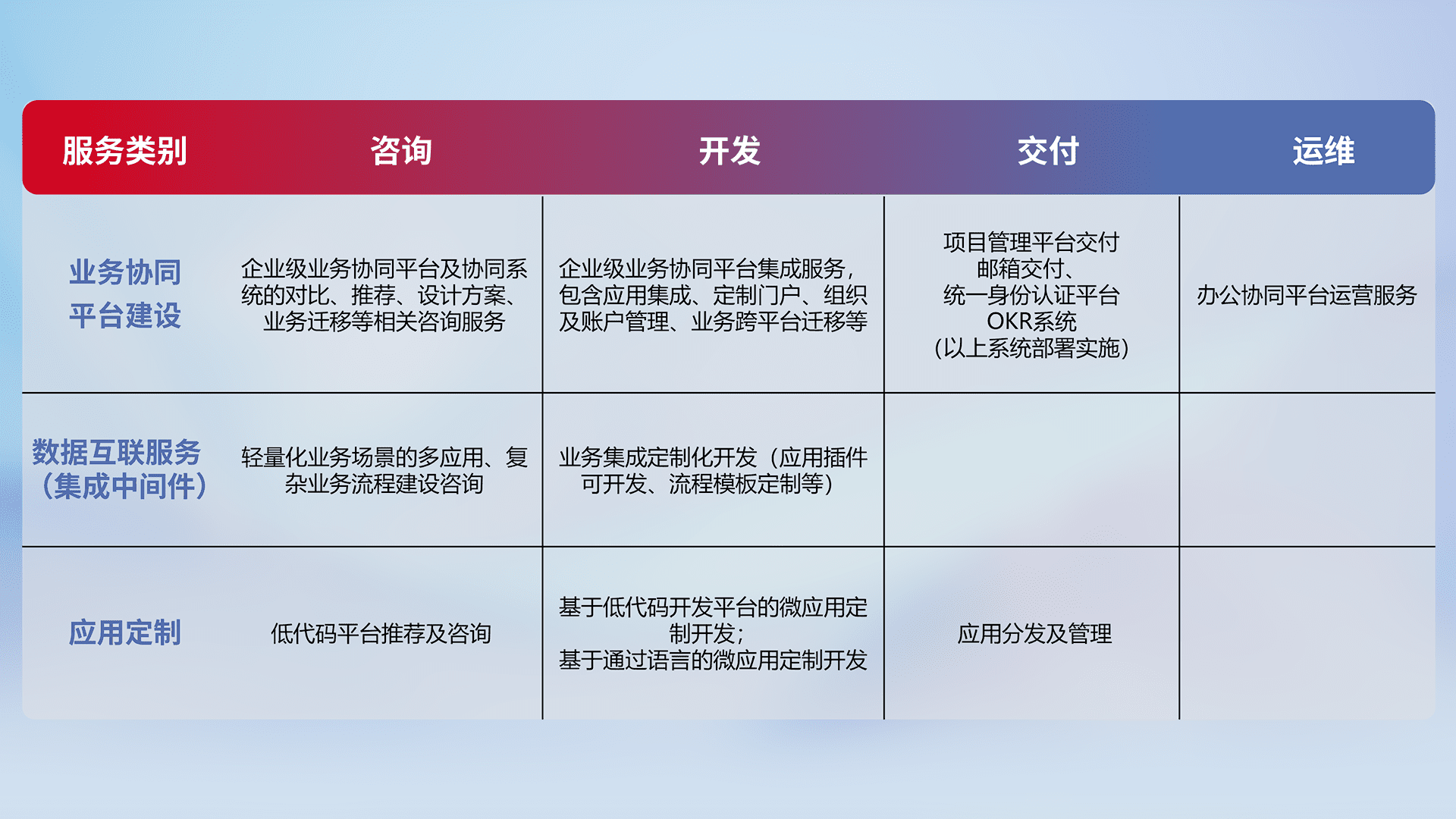 针对钉钉、、、企微、、IDaas等平台级产品提供产品的规划、、方案、、、、交付、、定制化开发等服务,,实现如统一协同办公、、、智能客户服务、、、混合会议管理、、智能数据查询、、、等业务场景,,实现数字化转型。。